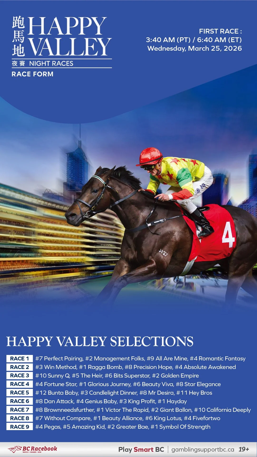 #7 Perfect Pairing is at his best at this track and trip, already a winner and a three-time placegetter, and his last-start third over 1800m had merit after he charged home from barrier 11. Barrier 3 is a map upgrade and puts him right in the firing line. #2 Management Folks is the class-dropper to note, one win from two at the level, and his 2200m Happy Valley record stands out, with two of his three wins coming over the trip. Barrier 1 and Purton add to the appeal. #9 All Are Mine has been trending the right way since joining the Brett Crawford stable, finishing off strongly into placings at his last two starts, and while barrier 10 likely forces him to settle back, he is one to watch late. #4 Romantic Fantasy maps well from barrier 4 and has been knocking on the door through three recent seconds.